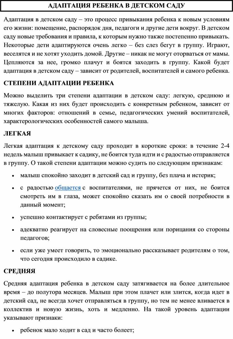 АДАПТАЦИЯ РЕБЕНКА В ДЕТСКОМ САДУ