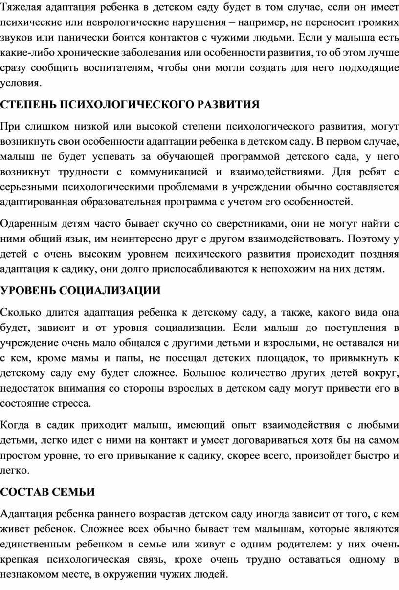 При слишком низкой или высокой степени психологического развития, могут возникнуть свои особенности адаптации ребенка в детском саду. В первом случае, малыш не будет успевать за обучающей программой детского сада, у него возникнут трудности с коммуникацией и взаимодействиями. Для ребят с серьезными психологическими проблемами в учреждении обычно составляется адаптированная образовательная программа с учетом его особенностей.
