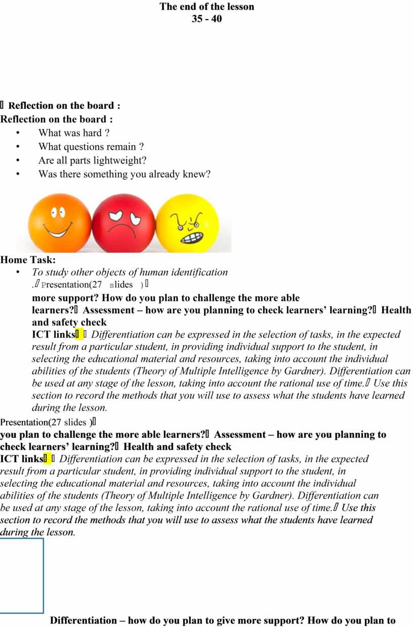 Were the lesson objectives/learning objectives realistic? Did all learners achieve the LO? If not, why? Did my planned differentiation work well? Did I stick to timings? What changes did I make from my plan and why?