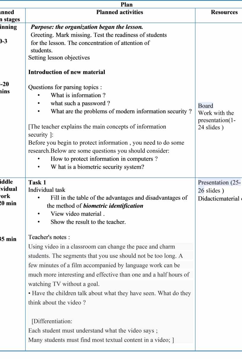 Task 1 Individual task • Fill in the table of the advantages and disadvantages of the method of biometric identification • View video material . • Show the result to the teacher.