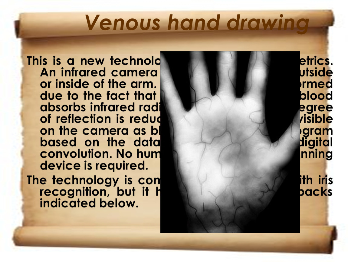 This is a new technology in the field of biometrics. An infrared camera takes pictures of the outside or inside of the arm. The pattern of veins is formed due to the fact that the hemoglobin of the blood absorbs infrared radiation. As a result, the degree of reflection is reduced and the veins are visible on the camera as black lines. A special program based on the data obtained creates a digital convolution. No human contact with the scanning device is required.
