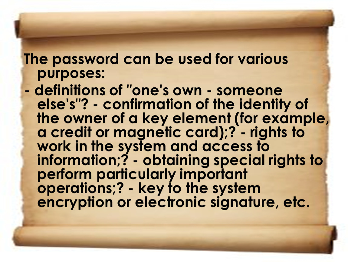 - definitions of "one's own - someone else's"? - confirmation of the identity of the owner of a key element (for example, a credit or magnetic card);? - rights to work in the system and access to information;? - obtaining special rights to perform particularly important operations;? - key to the system encryption or electronic signature, etc.