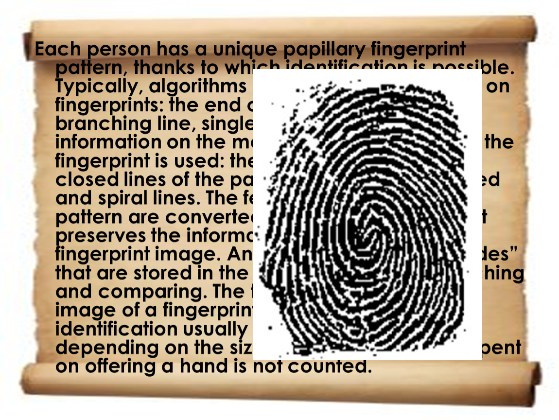 Each person has a unique papillary fingerprint pattern, thanks to which identification is possible. Typically, algorithms use characteristic points on fingerprints: the end of the pattern line, the branching line, single points. Additionally, information on the morphological structure of the fingerprint is used: the relative position of the closed lines of the papillary pattern, the arched and spiral lines. The features of the papillary pattern are converted into a unique code that preserves the information content of the fingerprint image. And it is the “fingerprint codes” that are stored in the database used for searching and comparing. The time for transferring the image of a fingerprint to a code and its identification usually do not exceed 1s, depending on the size of the base. The time spent on offering a hand is not counted.