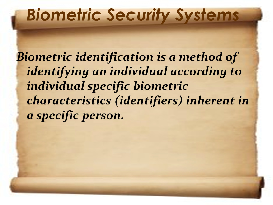 Biometric identification is a method of identifying an individual according to individual specific biometric characteristics (identifiers) inherent in a specific person.