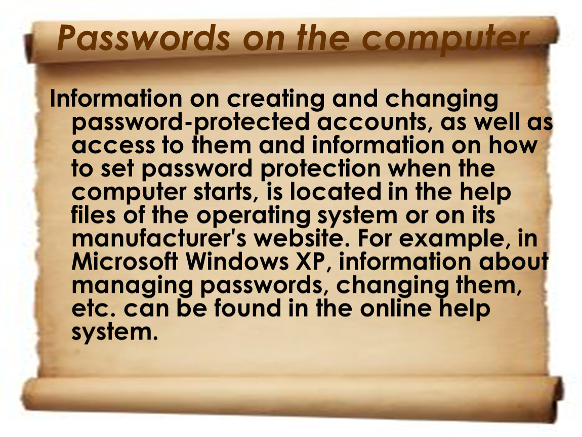 Information on creating and changing password-protected accounts, as well as access to them and information on how to set password protection when the computer starts, is located in the help files of the operating system or on its manufacturer's website. For example, in Microsoft Windows XP, information about managing passwords, changing them, etc. can be found in the online help system.