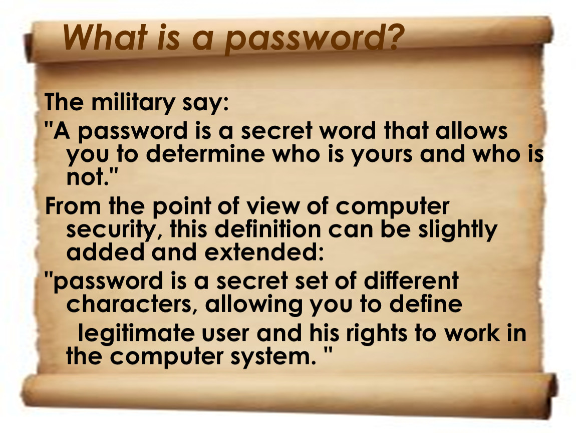 "A password is a secret word that allows you to determine who is yours and who is not."