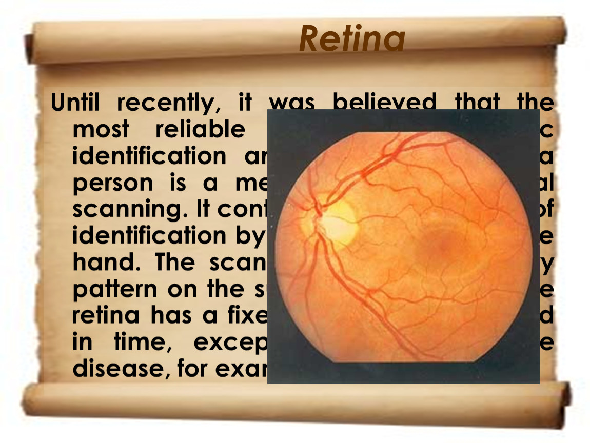 Until recently, it was believed that the most reliable method of biometric identification and authentication of a person is a method based on retinal scanning. It contains the best features of identification by the iris and veins of the hand. The scanner reads the capillary pattern on the surface of the retina. The retina has a fixed structure, unchanged in time, except as a result of eye disease, for example, cataracts.