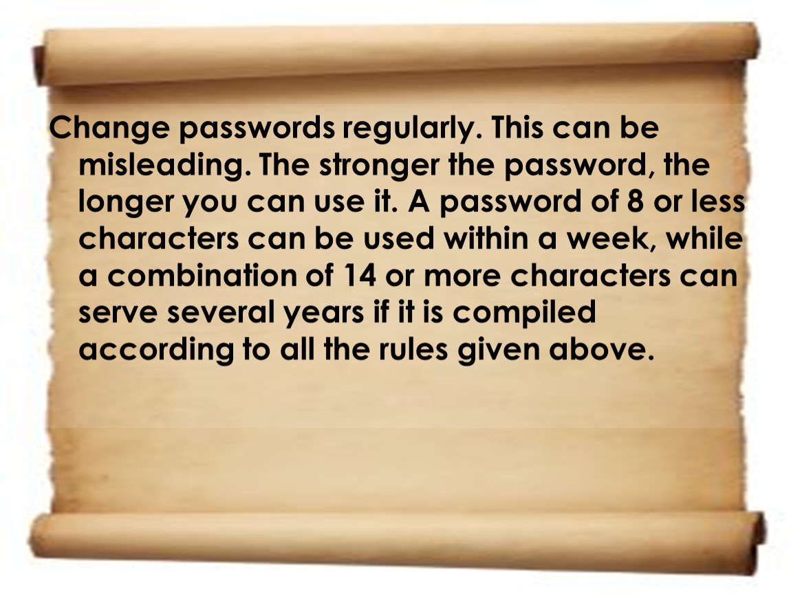 Change passwords regularly. This can be misleading. The stronger the password, the longer you can use it. A password of 8 or less characters can be used within a week, while a combination of 14 or more characters can serve several years if it is compiled according to all the rules given above.