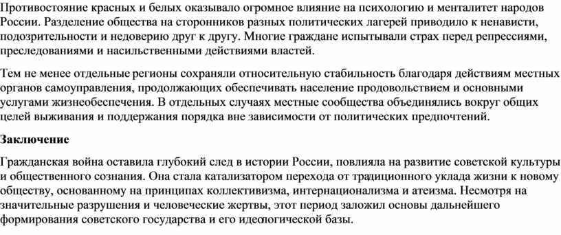 Противостояние красных и белых оказывало огромное влияние на психологию и менталитет народов России. Разделение общества на сторонников разных политических лагерей приводило к ненависти, подозрительности и недоверию друг к другу. Многие граждане испытывали страх перед репрессиями, преследованиями и насильственными действиями властей.