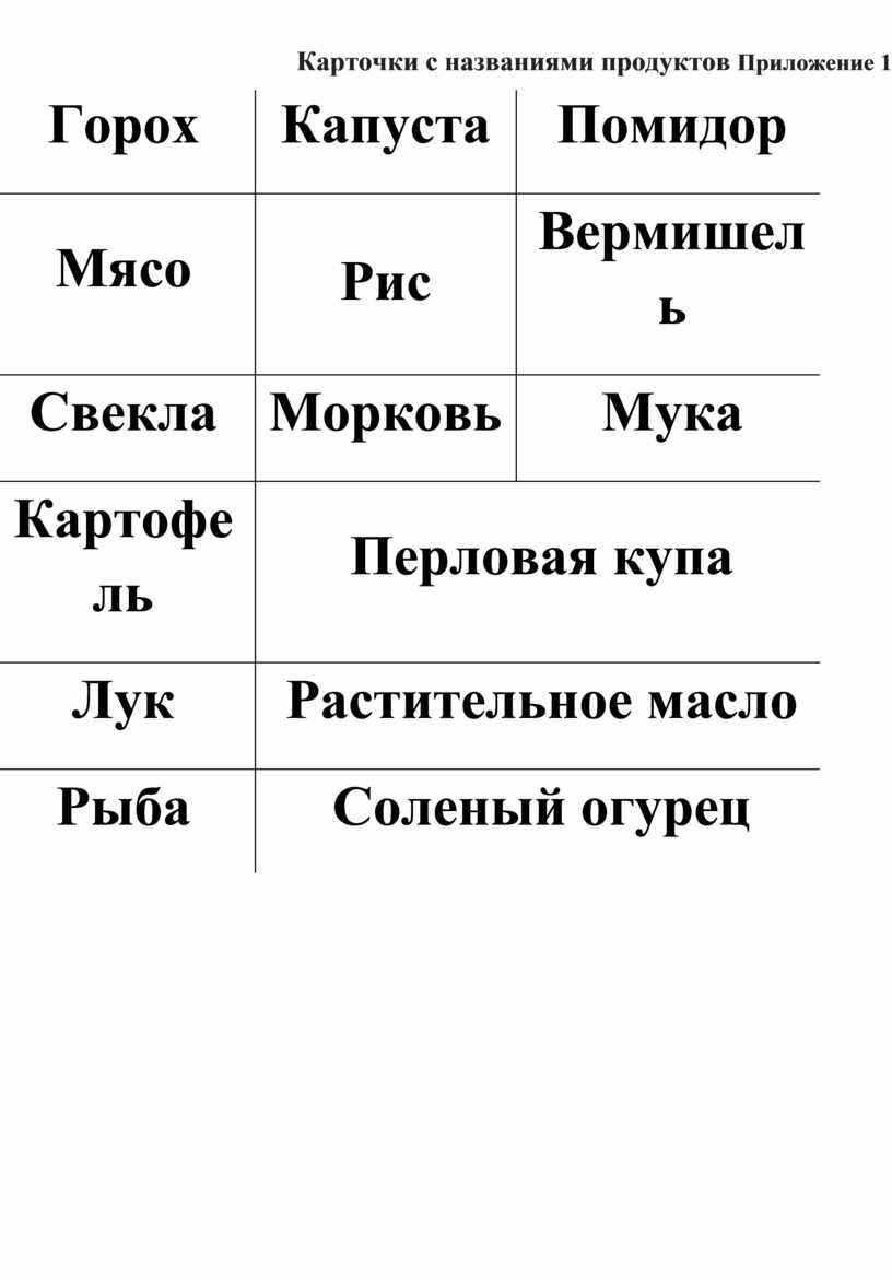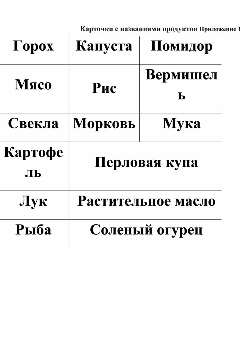 Карточки с названиями продуктов Приложение 1