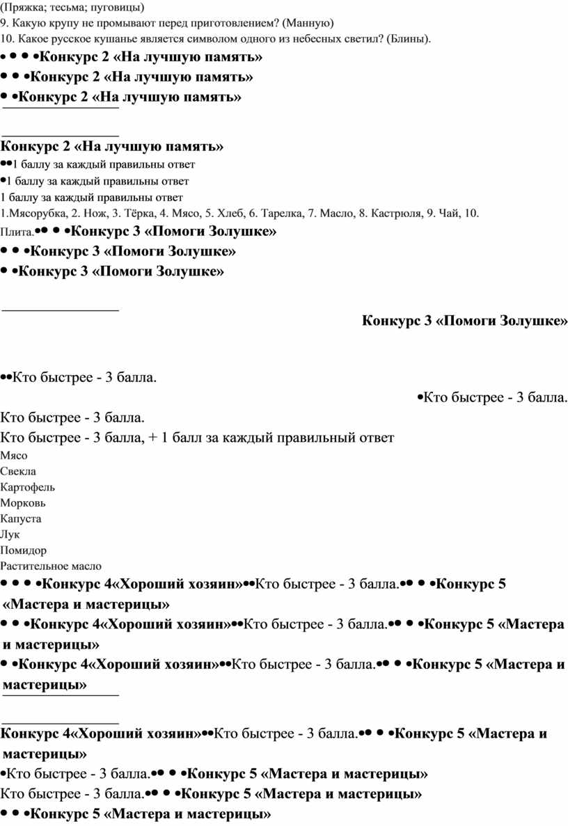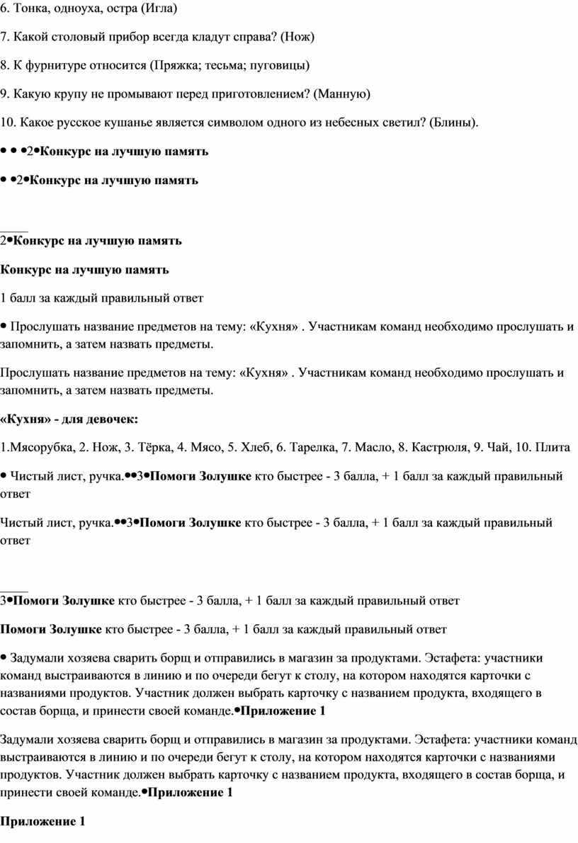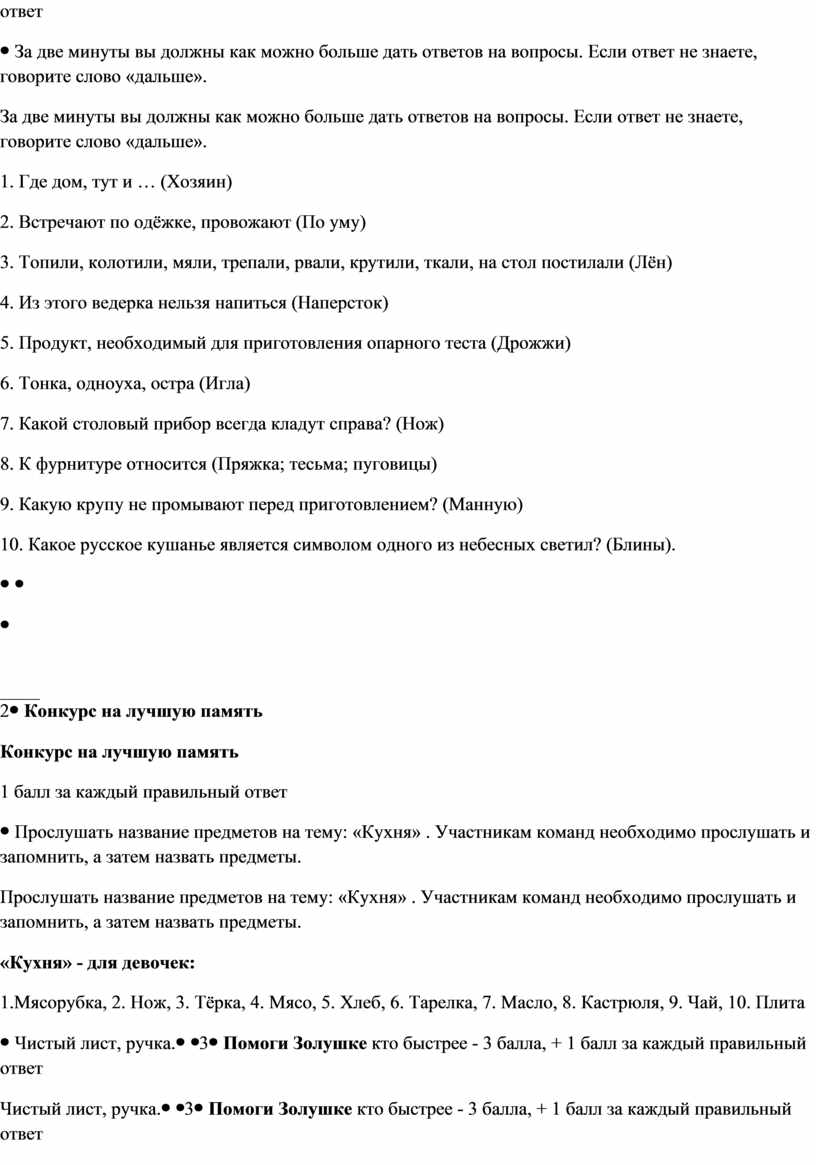 За две минуты вы должны как можно больше дать ответов на вопросы. Если ответ не знаете, говорите слово «дальше». 1. Где дом, тут и … (Хозяин) 2. Встречают по одёжке, провожают (По уму) 3. Топили, колотили, мяли, трепали, рвали, крутили, ткали, на стол постилали (Лён) 4. Из этого ведерка нельзя напиться (Наперсток) 5. Продукт, необходимый для приготовления опарного теста (Дрожжи) 6. Тонка, одноуха, остра (Игла) 7. Какой столовый прибор всегда кладут справа? (Нож) 8. К фурнитуре относится (Пряжка; тесьма; пуговицы) 9. Какую крупу не промывают перед приготовлением? (Манную) 10. Какое русское кушанье является символом одного из небесных светил? (Блины).