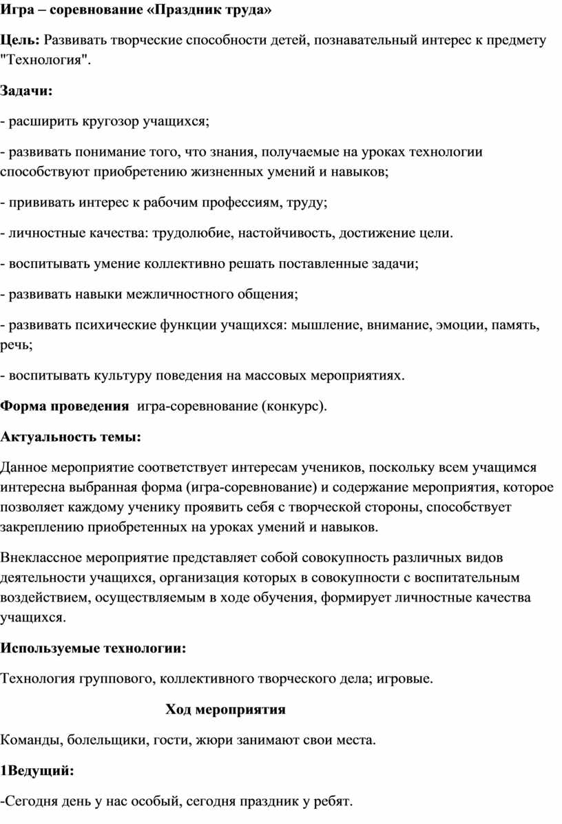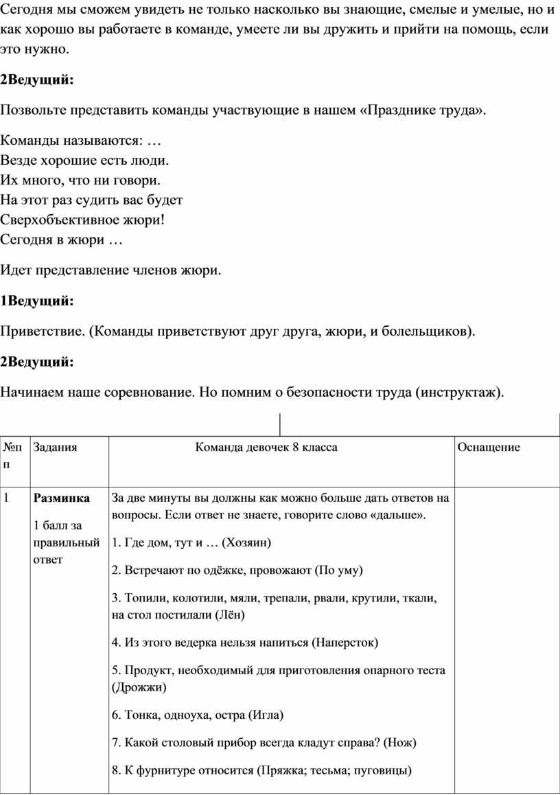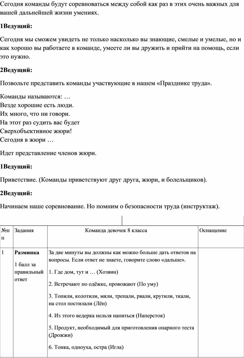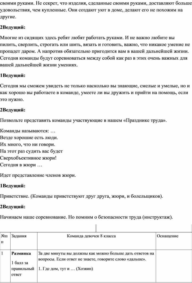Многие из сидящих здесь ребят любят работать руками. И не важно любите вы пилить, сверлить, строгать или шить, вязать и готовить, важно, что никакое умение не пропадет даром. А напротив обязательно пригодится вам в вашей дальнейшей жизни. Сегодня команды будут соревноваться между собой как раз в этих очень важных для вашей дальнейшей жизни умениях.