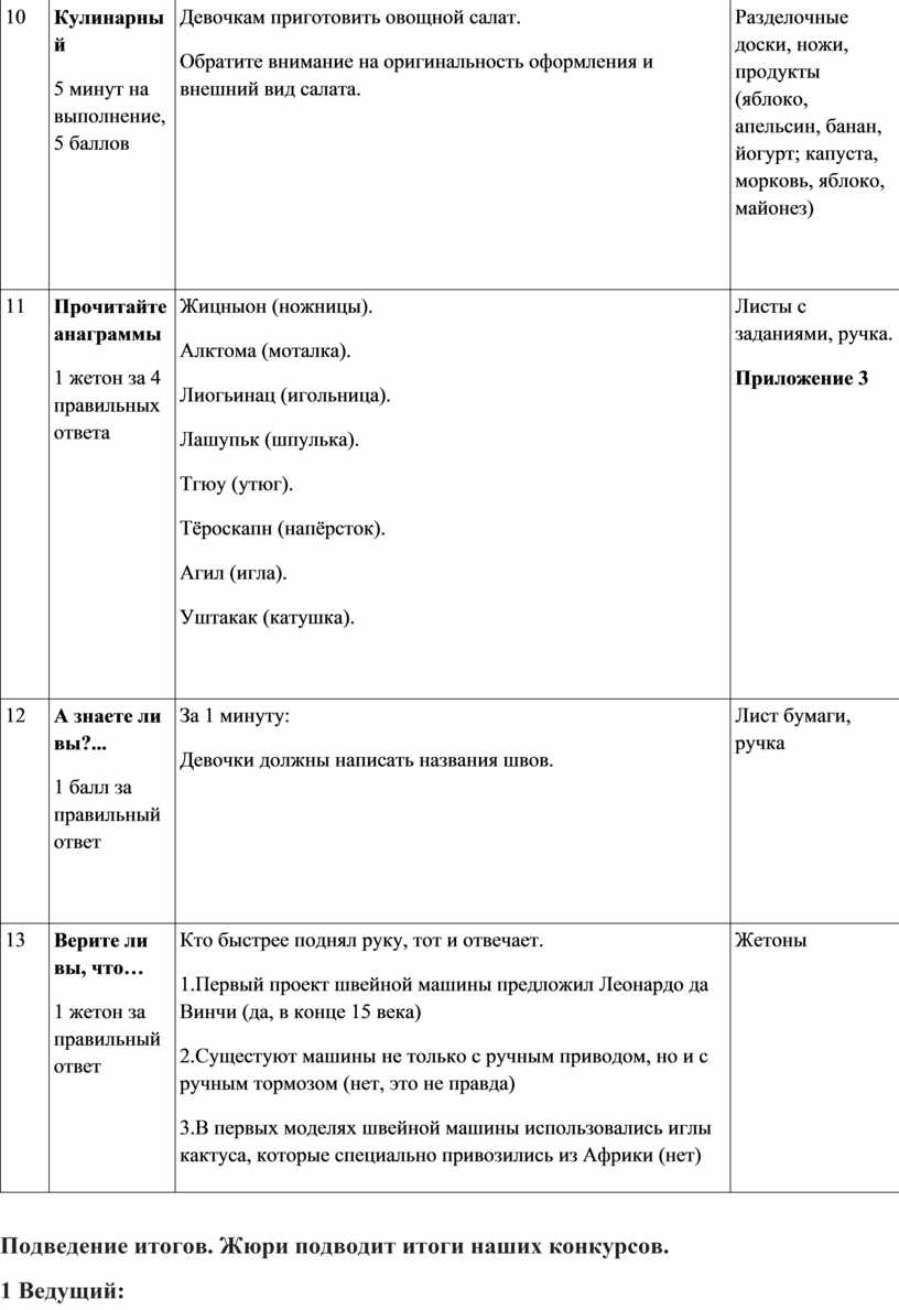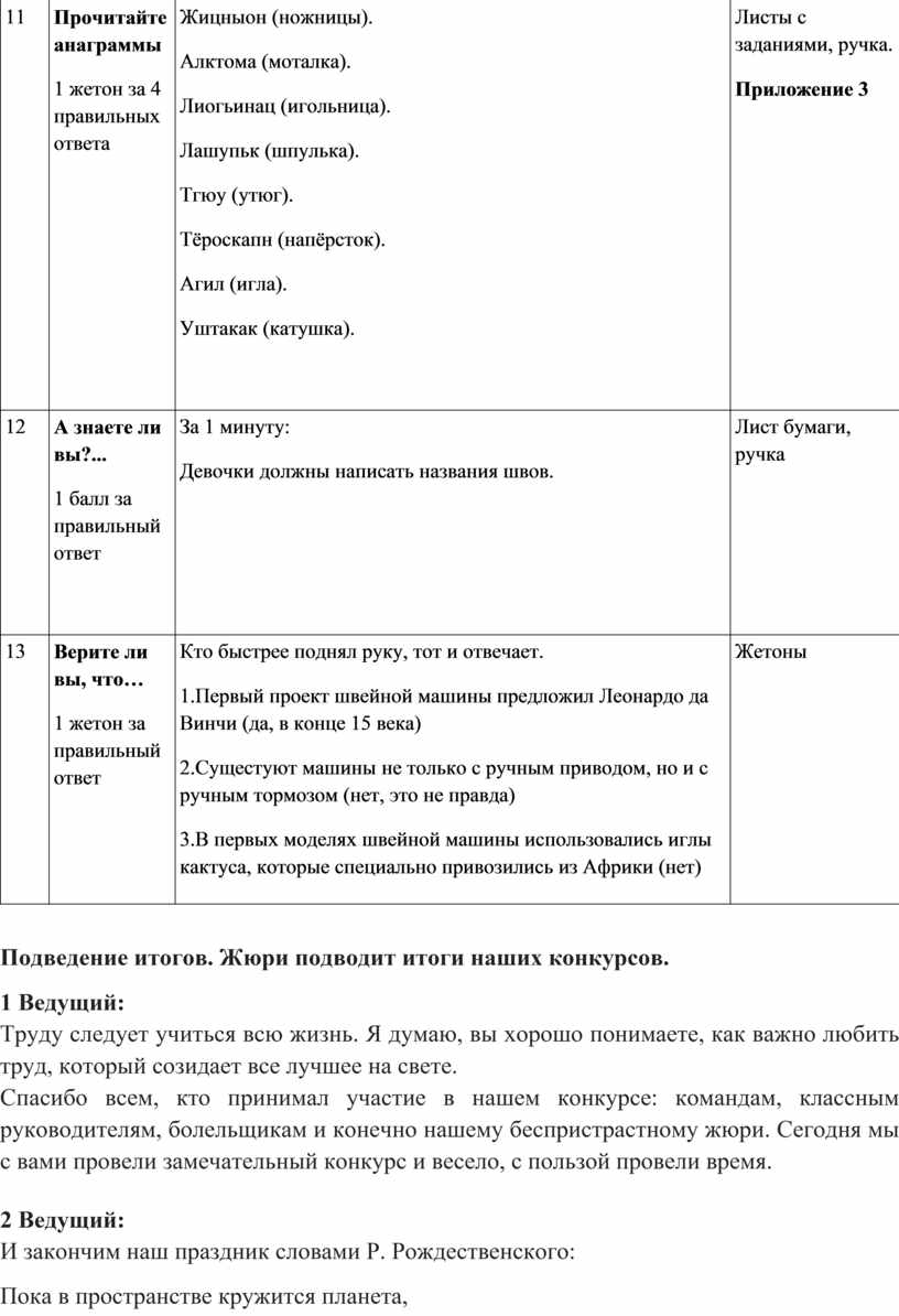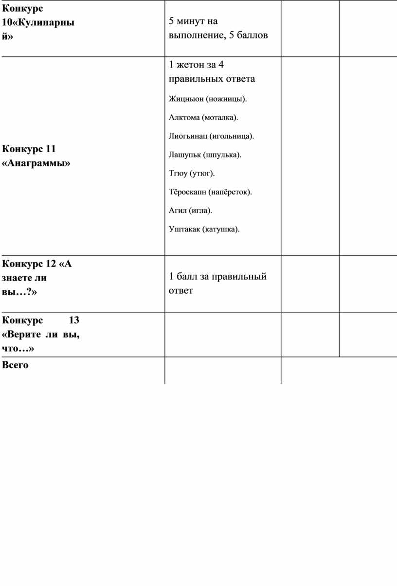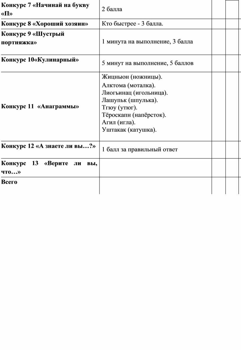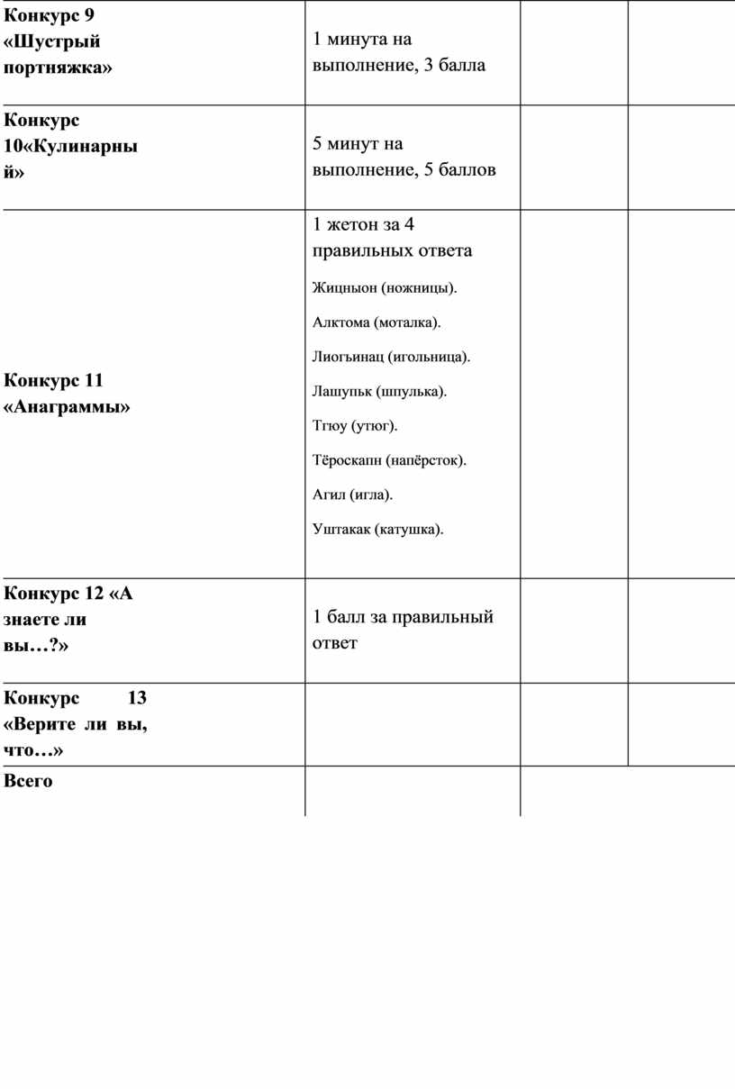 1 жетон за 4 правильных ответа Жицныон (ножницы). Алктома (моталка). Лиогьинац (игольница). Лашупьк (шпулька). Тгюу (утюг). Тёроскапн (напёрсток). Агил (игла). Уштакак (катушка).