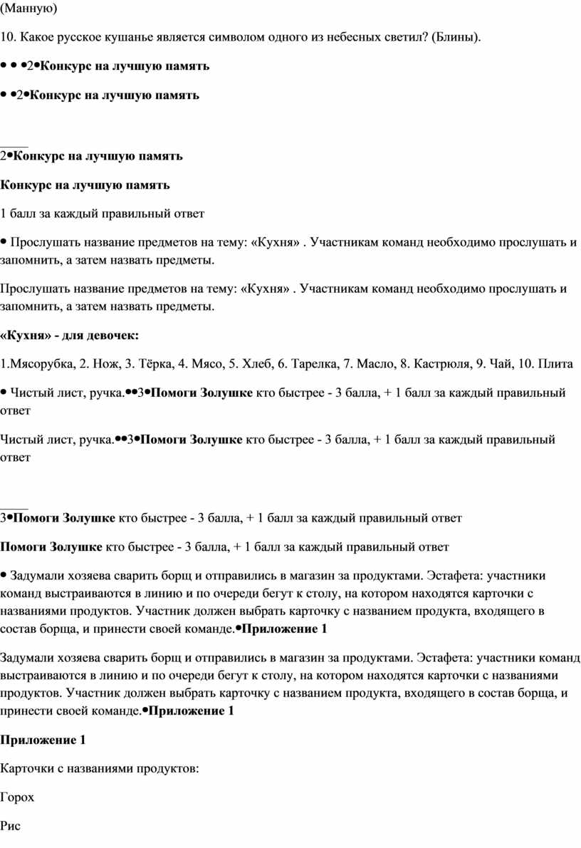 Приложение 1 Карточки с названиями продуктов: Горох Рис Мясо Свекла Картофель Морковь Капуста Перловая купа Соленый огурец Лук Помидор Вермишель Мука Рыба Растительное масло