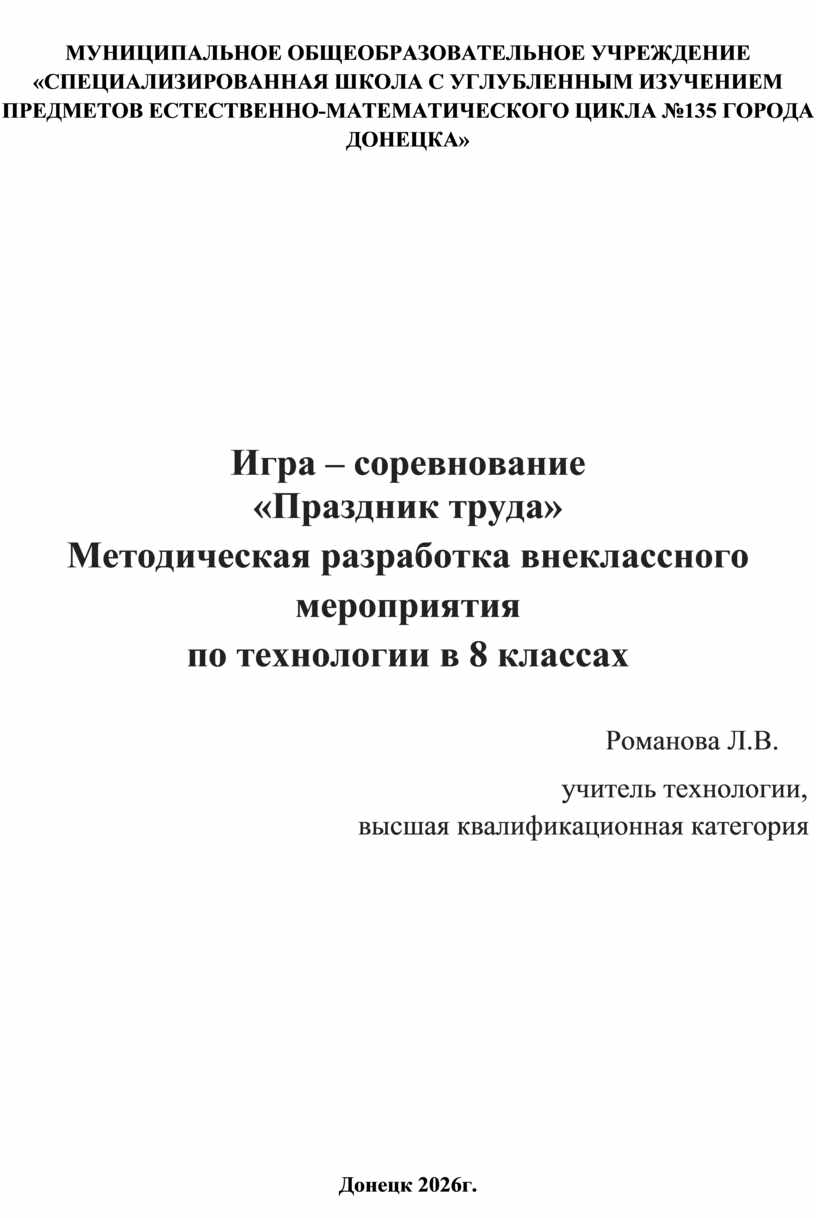 МУНИЦИПАЛЬНОЕ ОБЩЕОБРАЗОВАТЕЛЬНОЕ УЧРЕЖДЕНИЕ «СПЕЦИАЛИЗИРОВАННАЯ ШКОЛА С УГЛУБЛЕННЫМ ИЗУЧЕНИЕМ ПРЕДМЕТОВ ЕСТЕСТВЕННО-МАТЕМАТИЧЕСКОГО ЦИКЛА №135 ГОРОДА ДОНЕЦКА»