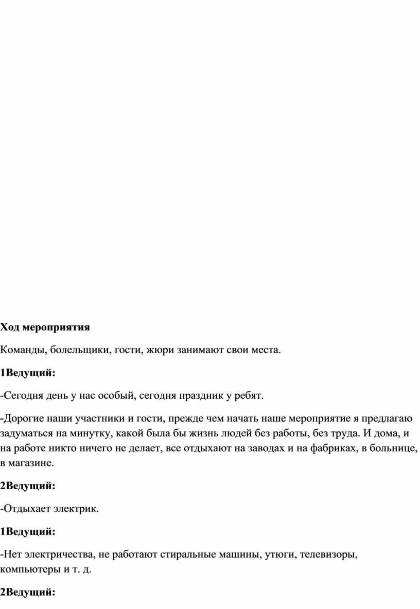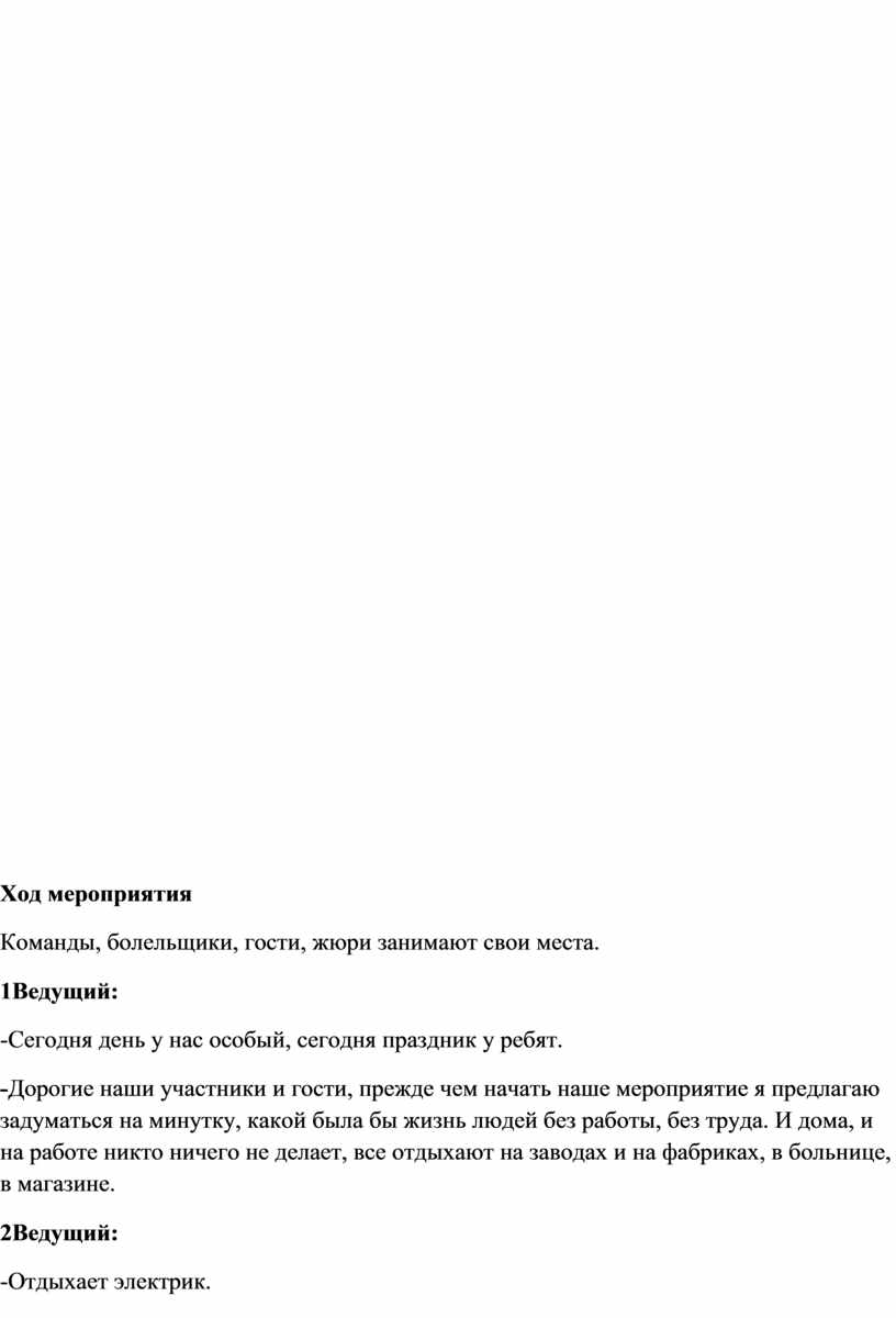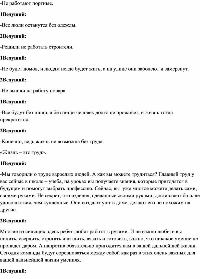 -Дорогие наши участники и гости, прежде чем начать наше мероприятие я предлагаю задуматься на минутку, какой была бы жизнь людей без работы, без труда. И дома, и на работе никто ничего не делает, все отдыхают на заводах и на фабриках, в больнице, в магазине.