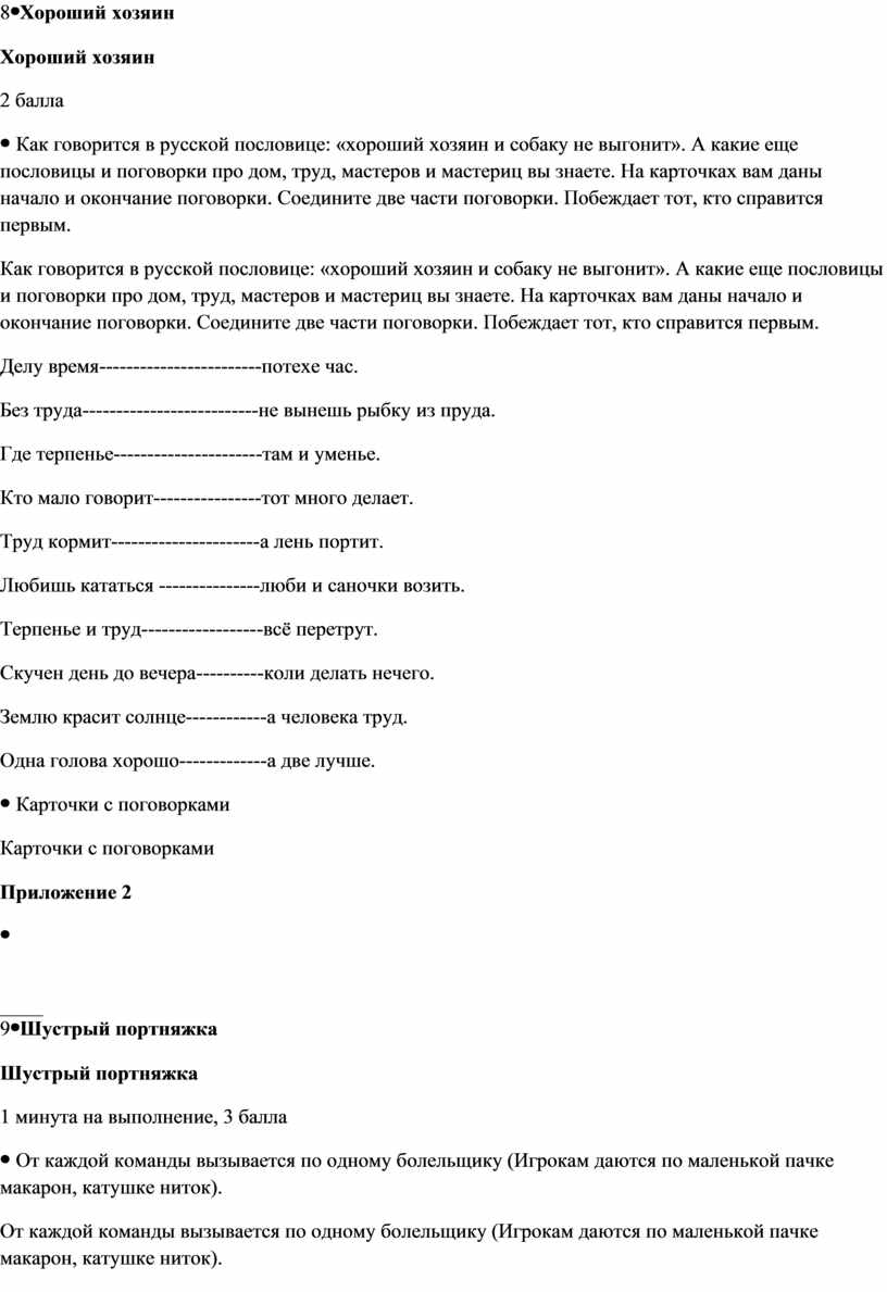 Как говорится в русской пословице: «хороший хозяин и собаку не выгонит». А какие еще пословицы и поговорки про дом, труд, мастеров и мастериц вы знаете. На карточках вам даны начало и окончание поговорки. Соедините две части поговорки. Побеждает тот, кто справится первым. Делу время------------------------потехе час. Без труда--------------------------не вынешь рыбку из пруда. Где терпенье----------------------там и уменье. Кто мало говорит----------------тот много делает. Труд кормит----------------------а лень портит. Любишь кататься ---------------люби и саночки возить. Терпенье и труд------------------всё перетрут. Скучен день до вечера----------коли делать нечего. Землю красит солнце------------а человека труд. Одна голова хорошо-------------а две лучше.