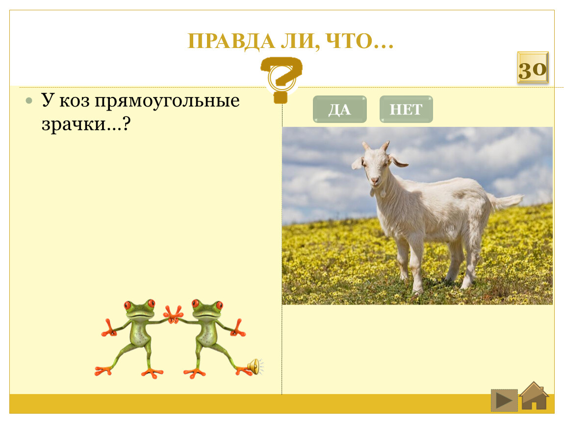 Зрачки коз расположены горизонтально: сужаясь, они становятся тонкой линией, а максимально расширяясь, превращаются в прямоугольник. Немаловажно, что такими глазами можно хорошо видеть в любое время суток – ведь многие хищники охотятся ночью, подбираясь в темноте к сонным козам.