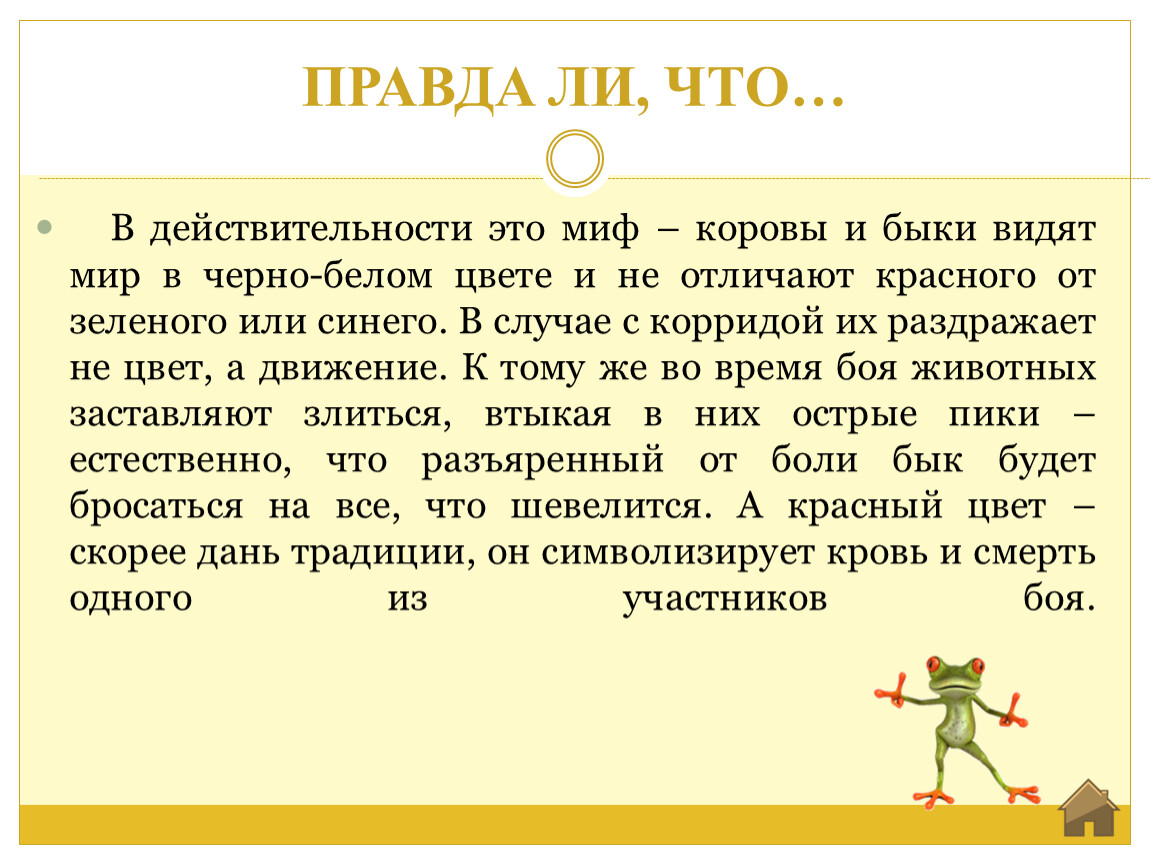 В действительности это миф – коровы и быки видят мир в черно-белом цвете и не отличают красного от зеленого или синего. В случае с корридой их раздражает не цвет, а движение. К тому же во время боя животных заставляют злиться, втыкая в них острые пики – естественно, что разъяренный от боли бык будет бросаться на все, что шевелится. А красный цвет – скорее дань традиции, он символизирует кровь и смерть одного из участников боя.