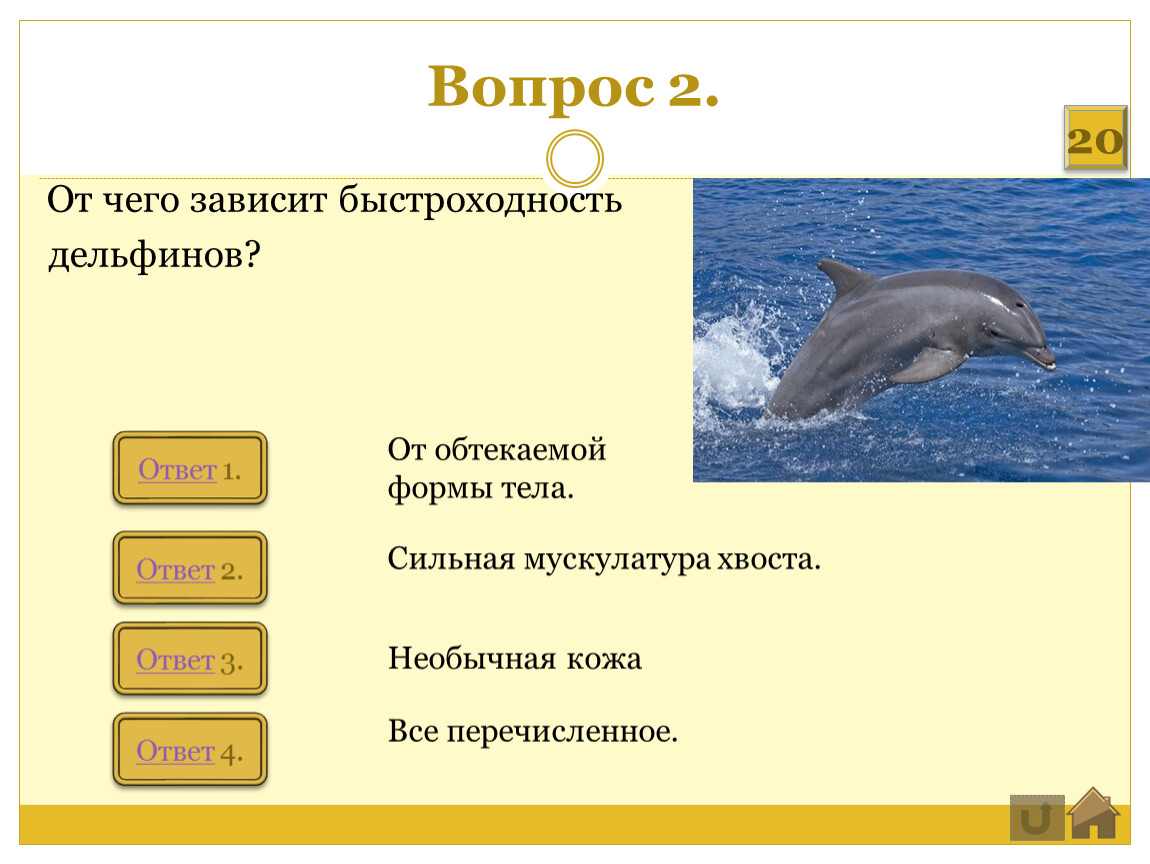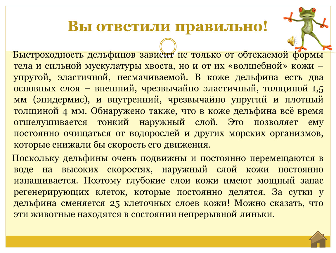 Быстроходность дельфинов зависит не только от обтекаемой формы тела и сильной мускулатуры хвоста, но и от их «волшебной» кожи – упругой, эластичной, несмачиваемой. В коже дельфина есть два основных слоя – внешний, чрезвычайно эластичный, толщиной 1,5 мм (эпидермис), и внутренний, чрезвычайно упругий и плотный толщиной 4 мм. Обнаружено также, что в коже дельфина всё время отшелушивается тонкий наружный слой. Это позволяет ему постоянно очищаться от водорослей и других морских организмов, которые снижали бы скорость его движения.