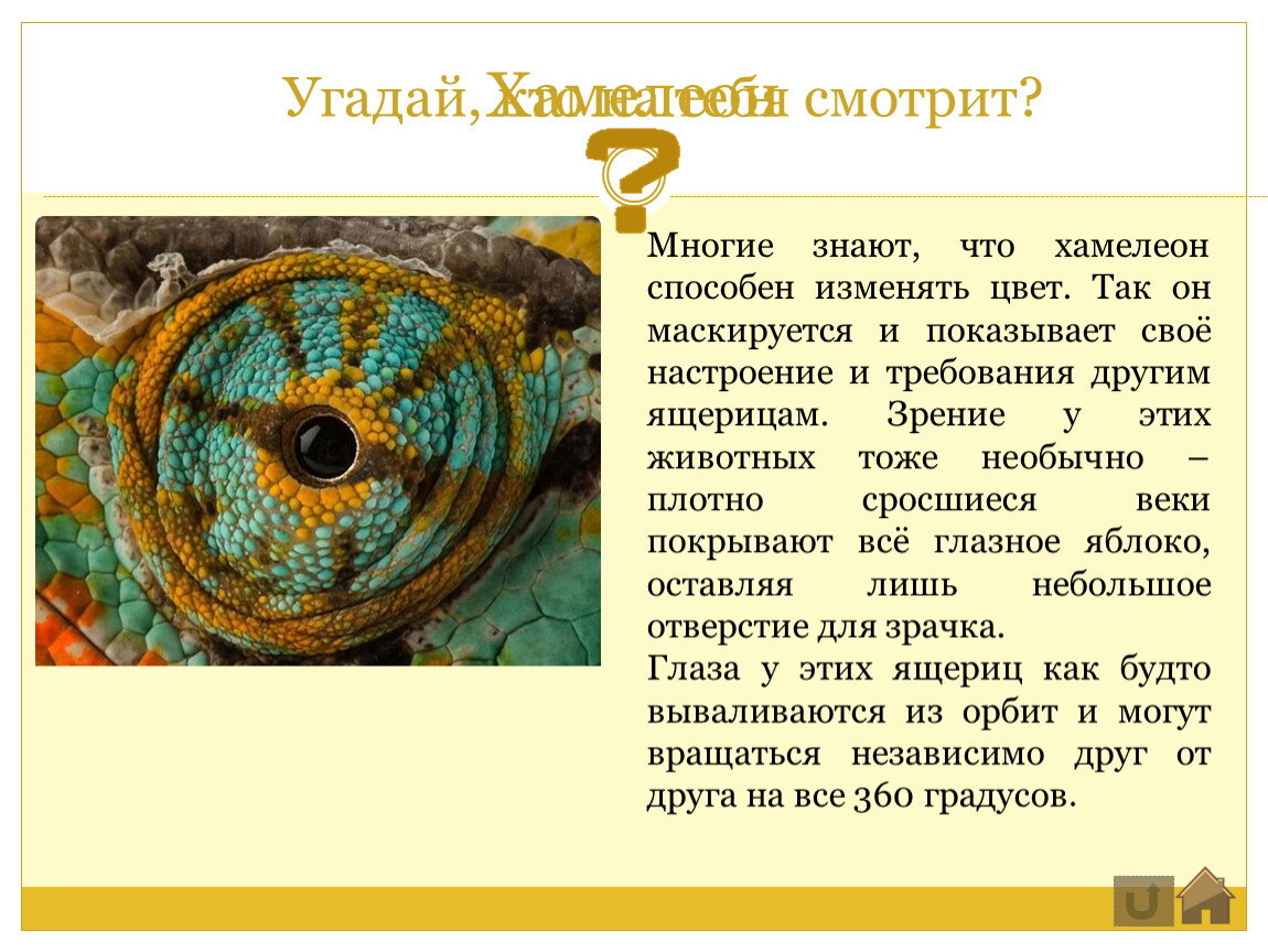 Многие знают, что хамелеон способен изменять цвет. Так он маскируется и показывает своё настроение и требования другим ящерицам. Зрение у этих животных тоже необычно – плотно сросшиеся веки покрывают всё глазное яблоко, оставляя лишь небольшое отверстие для зрачка.