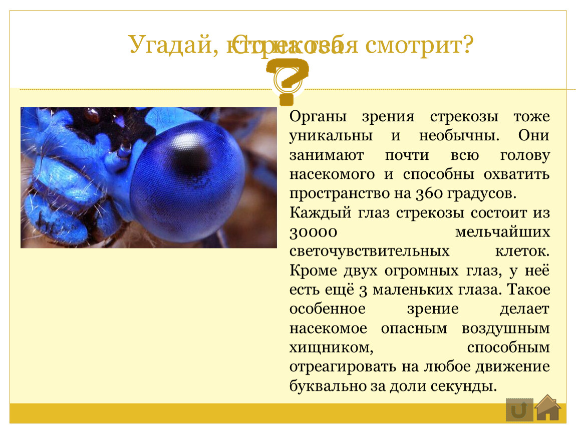 Каждый глаз стрекозы состоит из 30000 мельчайших светочувствительных клеток. Кроме двух огромных глаз, у неё есть ещё 3 маленьких глаза. Такое особенное зрение делает насекомое опасным воздушным хищником, способным отреагировать на любое движение буквально за доли секунды.
