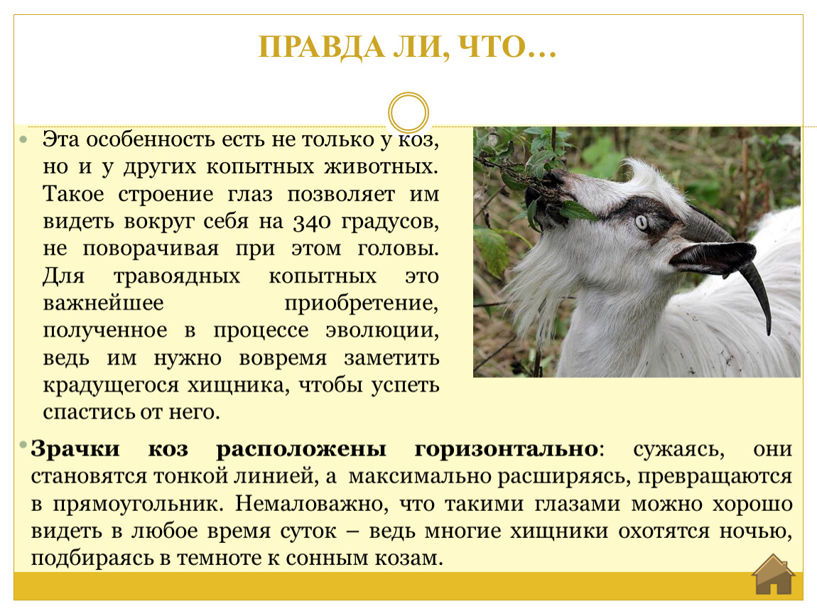 Эта особенность есть не только у коз, но и у других копытных животных. Такое строение глаз позволяет им видеть вокруг себя на 340 градусов, не поворачивая при этом головы. Для травоядных копытных это важнейшее приобретение, полученное в процессе эволюции, ведь им нужно вовремя заметить крадущегося хищника, чтобы успеть спастись от него.