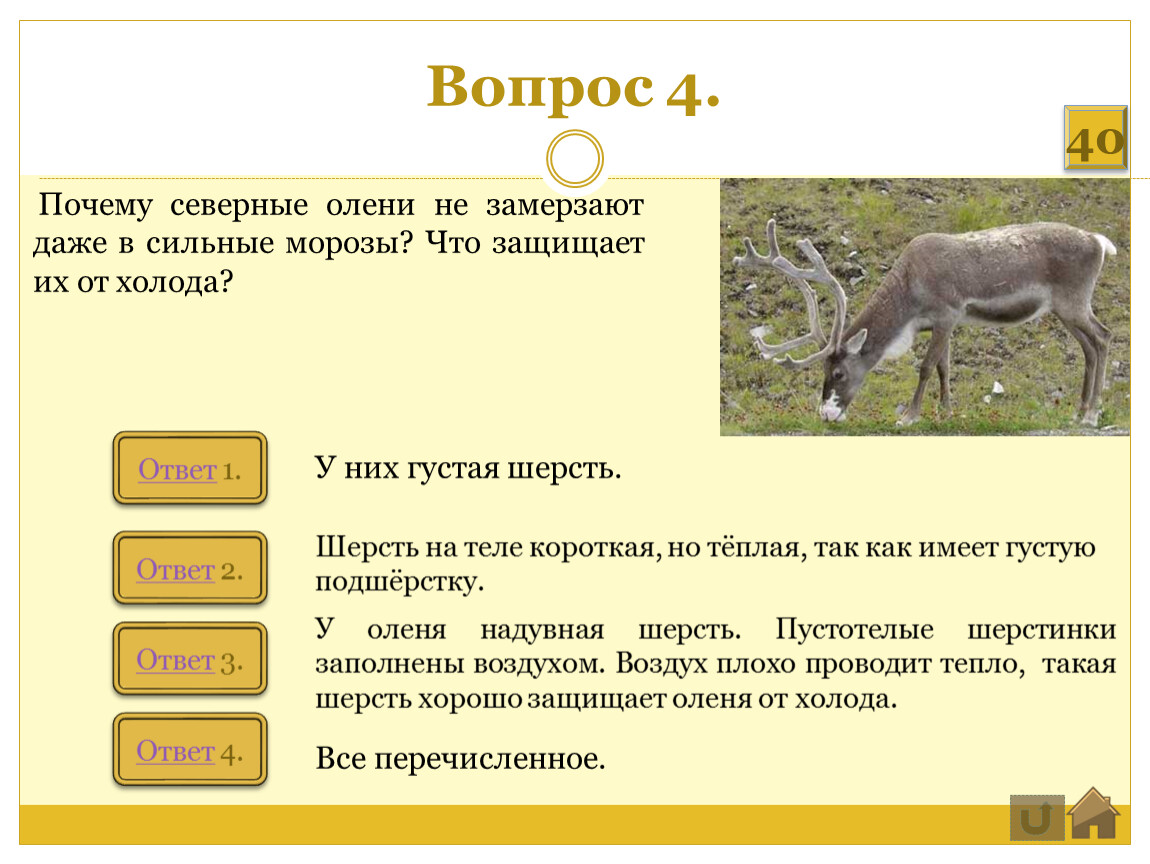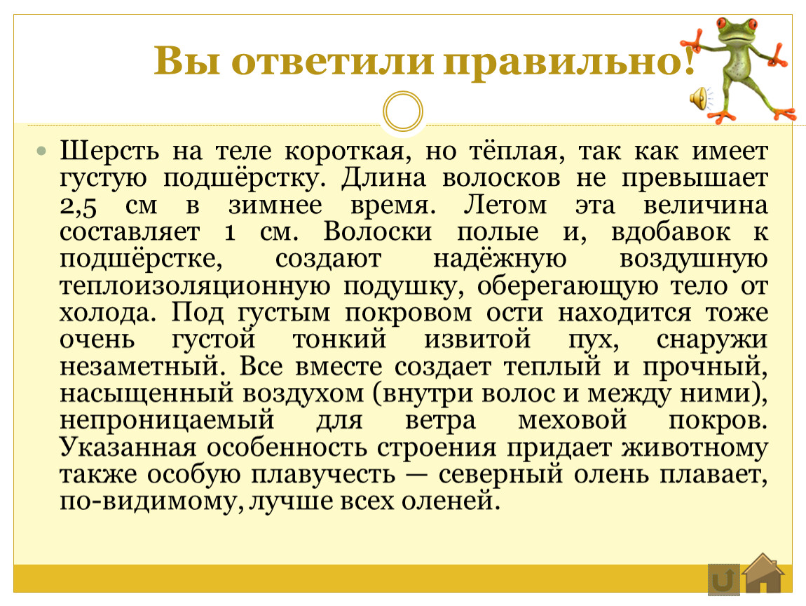У оленя надувная шерсть. Пустотелые шерстинки заполнены воздухом. Воздух плохо проводит тепло, такая шерсть хорошо защищает оленя от холода.