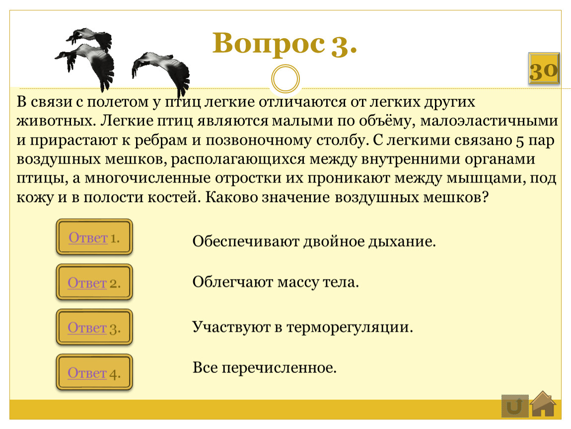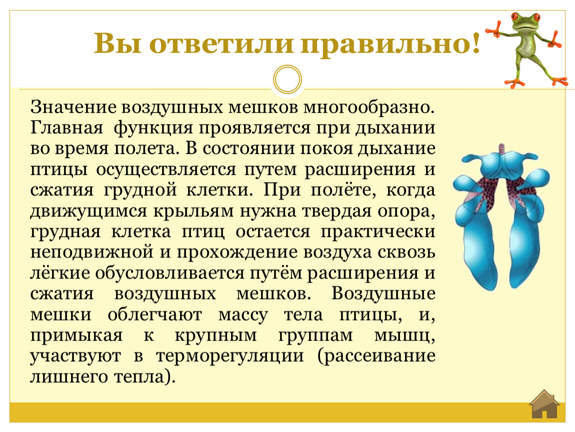 В связи с полетом у птиц легкие отличаются от легких других животных. Легкие птиц являются малыми по объёму, малоэластичными и прирастают к ребрам и позвоночному столбу. С легкими связано 5 пар воздушных мешков, располагающихся между внутренними органами птицы, а многочисленные отростки их проникают между мышцами, под кожу и в полости костей. Каково значение воздушных мешков?