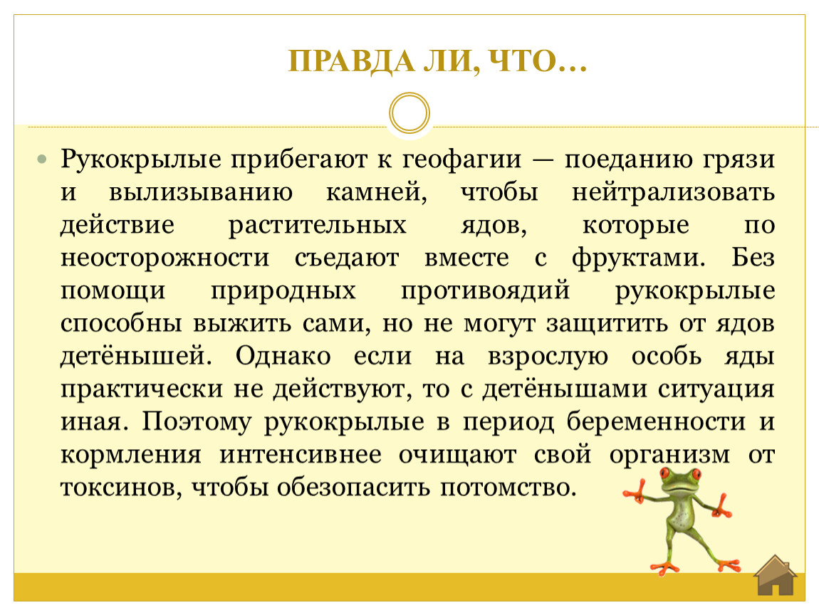Рукокрылые прибегают к геофагии — поеданию грязи и вылизыванию камней, чтобы нейтрализовать действие растительных ядов, которые по неосторожности съедают вместе с фруктами. Без помощи природных противоядий рукокрылые способны выжить сами, но не могут защитить от ядов детёнышей. Однако если на взрослую особь яды практически не действуют, то с детёнышами ситуация иная. Поэтому рукокрылые в период беременности и кормления интенсивнее очищают свой организм от токсинов, чтобы обезопасить потомство.