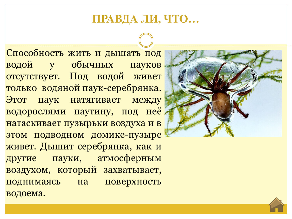 Способность жить и дышать под водой у обычных пауков отсутствует. Под водой живет только водяной паук-серебрянка. Этот паук натягивает между водорослями паутину, под неё натаскивает пузырьки воздуха и в этом подводном домике-пузыре живет. Дышит серебрянка, как и другие пауки, атмосферным воздухом, который захватывает, поднимаясь на поверхность водоема.