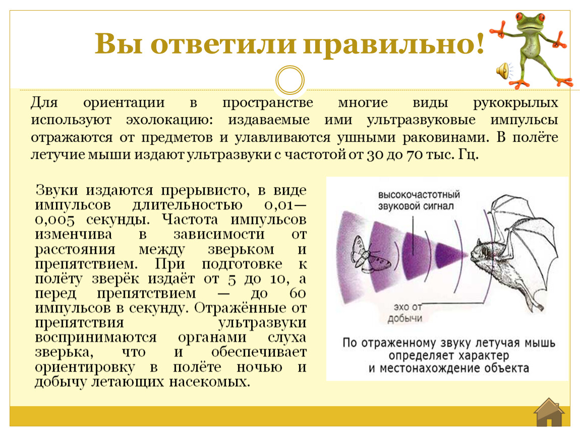 Для ориентации в пространстве многие виды рукокрылых используют эхолокацию: издаваемые ими ультразвуковые импульсы отражаются от предметов и улавливаются ушными раковинами. В полёте летучие мыши издают ультразвуки с частотой от 30 до 70 тыс. Гц.