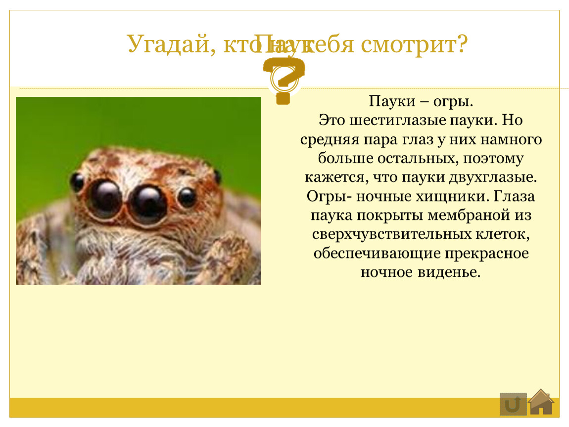 Пауки – огры.Это шестиглазые пауки. Но средняя пара глаз у них намного больше остальных, поэтому кажется, что пауки двухглазые.Огры- ночные хищники. Глаза паука покрыты мембраной из сверхчувствительных клеток, обеспечивающие прекрасное ночное виденье.