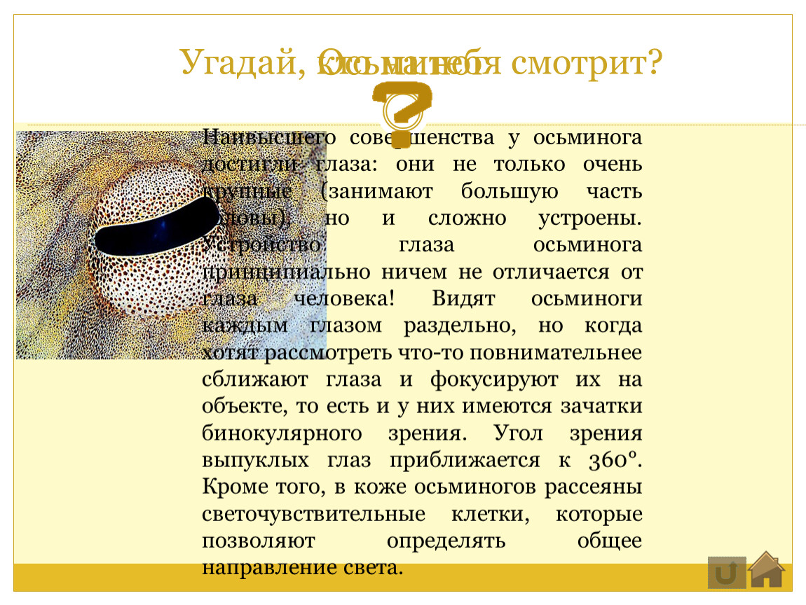 Наивысшего совершенства у осьминога достигли глаза: они не только очень крупные (занимают большую часть головы), но и сложно устроены. Устройство глаза осьминога принципиально ничем не отличается от глаза человека! Видят осьминоги каждым глазом раздельно, но когда хотят рассмотреть что-то повнимательнее сближают глаза и фокусируют их на объекте, то есть и у них имеются зачатки бинокулярного зрения. Угол зрения выпуклых глаз приближается к 360°. Кроме того, в коже осьминогов рассеяны светочувствительные клетки, которые позволяют определять общее направление света.
