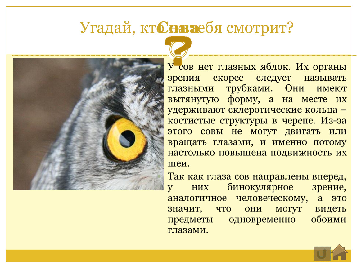 Так как глаза сов направлены вперед, у них бинокулярное зрение, аналогичное человеческому, а это значит, что они могут видеть предметы одновременно обоими глазами.