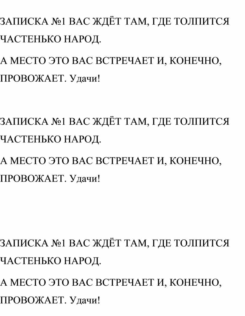 ЗАПИСКА №1 ВАС ЖДЁТ ТАМ, ГДЕ ТОЛПИТСЯ ЧАСТЕНЬКО НАРОД.