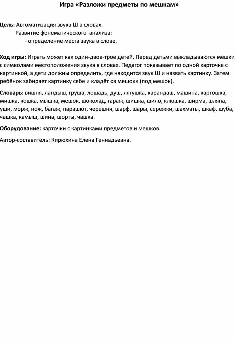 Ход игры: Играть может как один-двое-трое детей. Перед детьми выкладываются мешки с символами местоположения звука в словах. Педагог показывает по одной карточке с картинкой, а дети должны определить, где находится звук Ш и назвать картинку. Затем ребёнок забирает картинку себе и кладёт «в мешок» (под мешок).