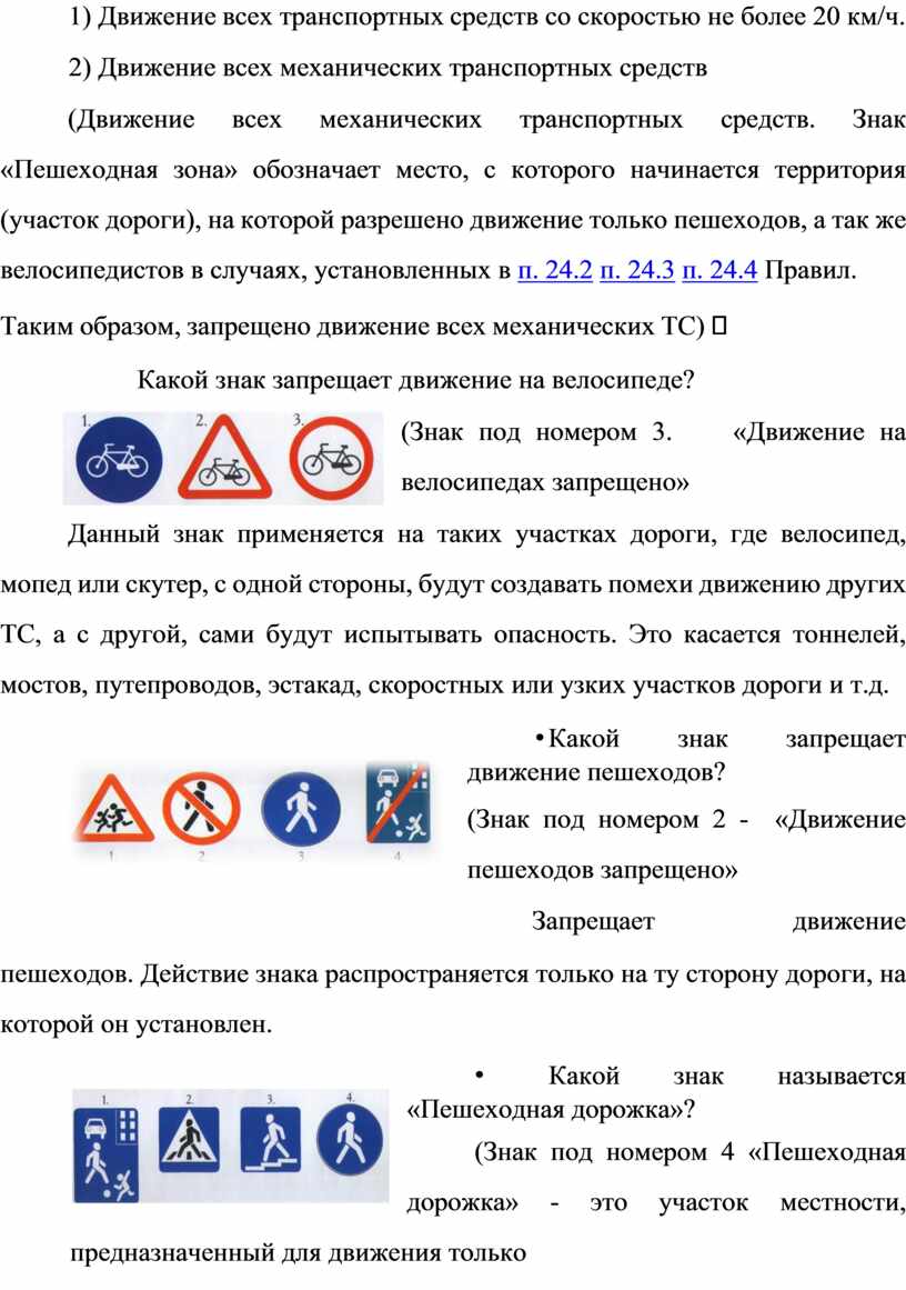 (Движение всех механических транспортных средств. Знак «Пешеходная зона» обозначает место, с которого начинается территория (участок дороги), на которой разрешено движение только пешеходов, а так же велосипедистов в случаях, установленных в п. 24.2 п. 24.3 п. 24.4 Правил.