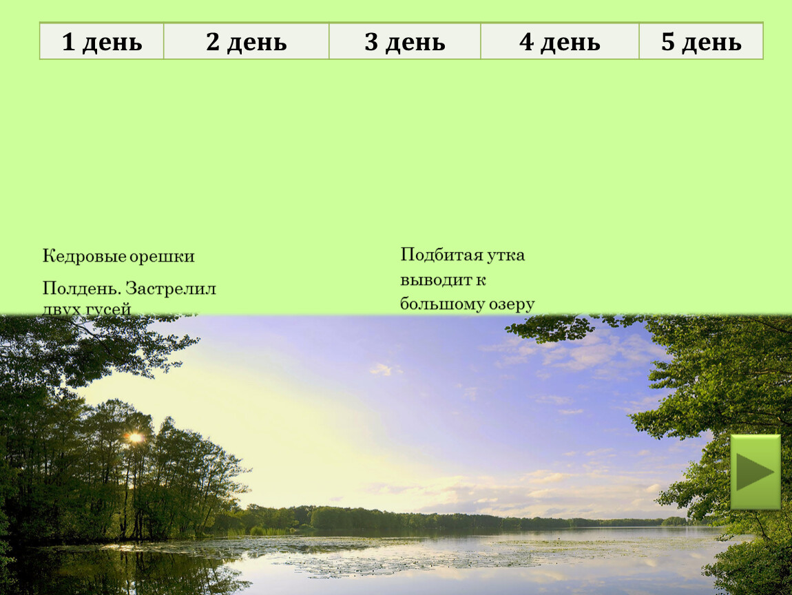 Кедровые орешки | Утром полез на дерево | Размышляет о происхождении озера | Полдень | Возвращение домой |