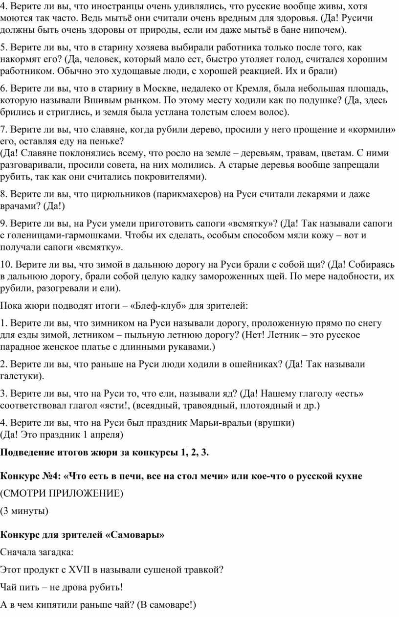 10. Верите ли вы, что зимой в дальнюю дорогу на Руси брали с собой щи? (Да! Собираясь в дальнюю дорогу, брали собой целую кадку замороженных щей. По мере надобности, их рубили, разогревали и ели).