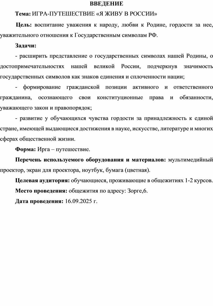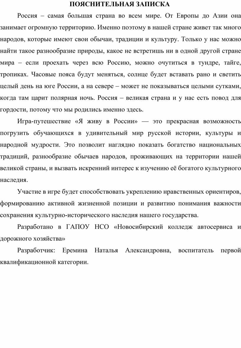 Игра-путешествие «Я живу в России» — это прекрасная возможность погрузить обучающихся в удивительный мир русской истории, культуры и народной мудрости. Это позволит наглядно показать богатство национальных традиций, разнообразие обычаев народов, проживающих на территории нашей великой страны, и вызвать искренний интерес к изучению её богатого культурного наследия.