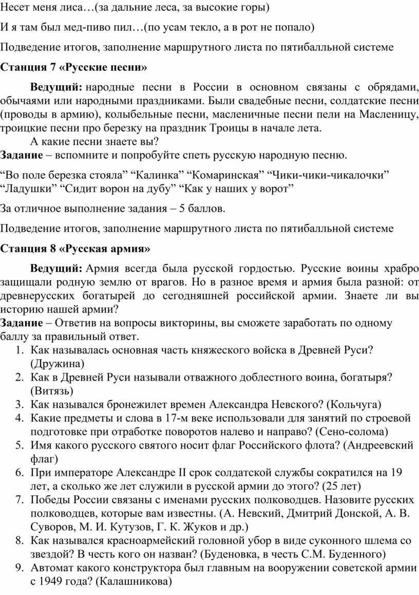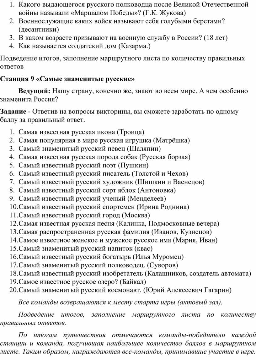 На каждой станции вам будут заданы вопросы или даны задания. За правильный ответ и хорошую работу команда получает баллы в маршрутный лист.