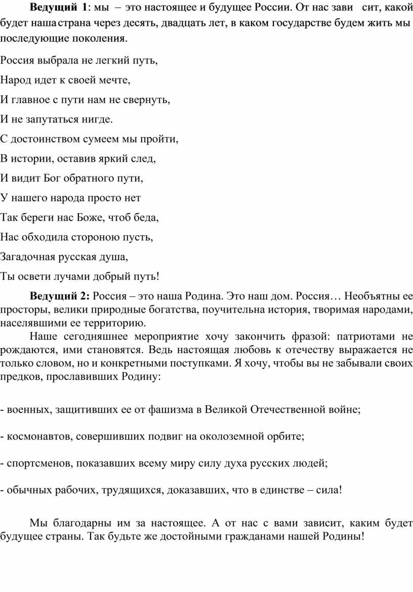 Ведущий 1: мы – это настоящее и будущее России. От нас зависит, какой будет наша страна через десять, двадцать лет, в каком государстве будем жить мы и последующие поколения.