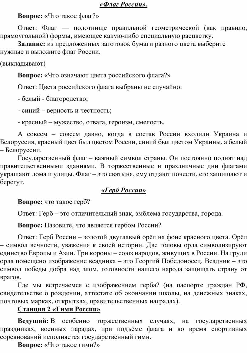 Ведущий: Каждый гражданин своей страны должен знать государственные символы. Есть они и у России. Это гимн, герб и флаг. На этой станции мы с вами вспомним всё, что вы знаете о флаге и гербе.