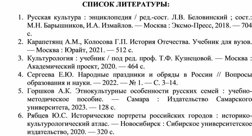 5. Горшков А.К. Этнокультурные особенности русских семей : учебно-методическое пособие. — Самара : Издательство Самарского университета, 2023. — 128 с.