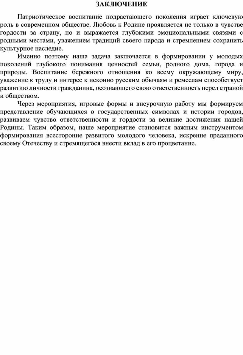 Через мероприятия, игровые формы и внеурочную работу мы формируем представление обучающихся о государственных символах и истории городов, развиваем чувство ответственности и гордости за великие достижения нашей Родины. Таким образом, наше мероприятие становится важным инструментом формирования всесторонне развитого молодого человека, искренне преданного своему Отечеству и стремящегося внести вклад в его процветание.