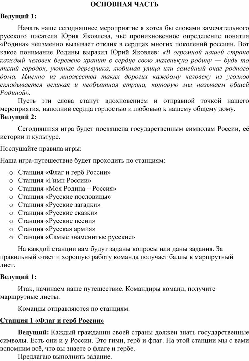 Начать наше сегодняшнее мероприятие я хотел бы словами замечательного русского писателя Юрия Яковлева, чьё проникновенное определение понятия «Родина» неизменно вызывает отклик в сердцах многих поколений россиян. Вот какое понимание Родины выразил Юрий Яковлев: «В огромной нашей стране каждый человек бережно хранит в сердце свою маленькую родину — будь то тихий городок, уютная деревушка, любимая улица или семейный очаг родного дома. Именно из множества таких дорогих каждому человеку из уголков складывается великая и необъятная страна, которую мы называем общей Родиной».