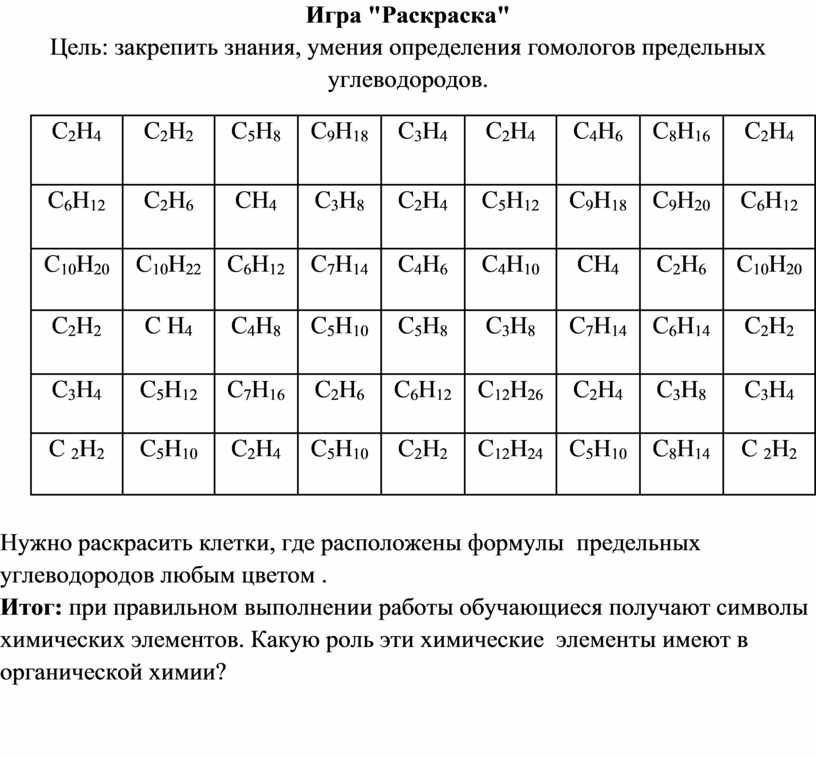 Нужно раскрасить клетки, где расположены формулы предельных углеводородов