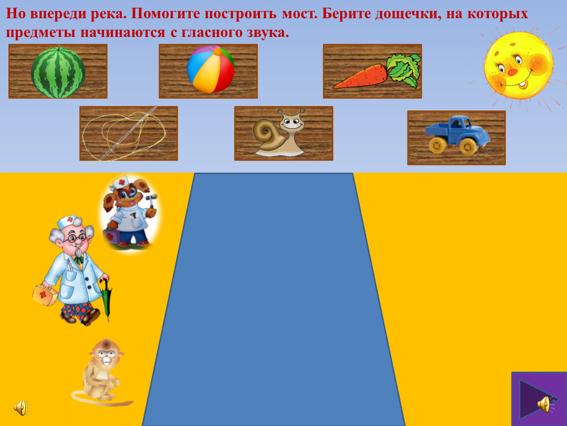 Но впереди река. Помогите построить мост. Берите дощечки, на которых