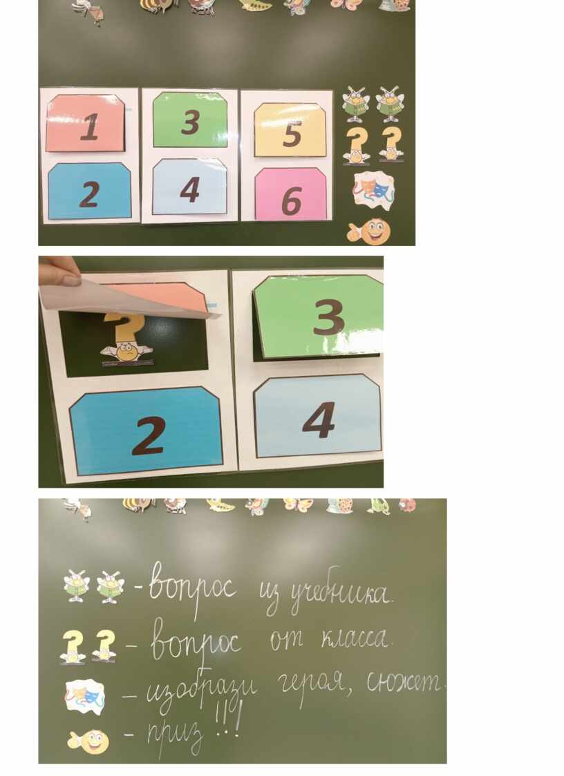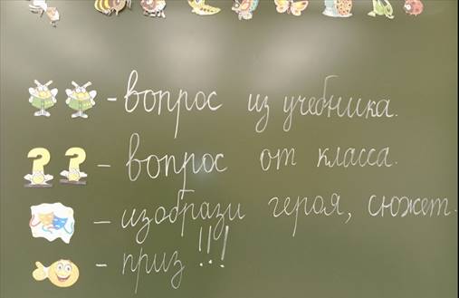 Содержание игры «Сюрприз» такое: я сделала 6 открывающихся окошек. При помощи магнитной ленты они с легкостью крепятся на доску. И 6 обозначений, которые перед проверкой размещаются в окошках. Сюрприз в том, что дети не знают в каком окошке какое обозначение размещено. Это и делает игру интересной. Желающий ответить ученик выходит к доске и открывает понравившееся окошко, достает обозначение и показывает классу. Если ему выпал жук с книгой, он выбирает помощника из класса, а тот в свою очередь выбирает вопрос из учебника по заданному тексту и выразительно зачитывает стоящему у доски. Так же помощник может зачитать маленький отрывок из текста, а отвечающий должен либо продолжить с помощью пересказа, либо описать к какому сюжету это относится. Если ученику достается обозначение знак вопроса, то это значит, что любой ученик из класса может задать свой вопрос по заданному произведению. Эти задания учат детей ориентироваться в тексте, в заданиях, учат умению формулировать свои вопросы, правильно выстраивать ответы, взаимодействовать друг с другом. Обозначение «театральная маска» означает, что отвечающий должен изобразить понравившегося ему героя или ситуацию из произведения, а класс должны отгадать, кого или что он изображает. По началу это задание было самым сложным. Дети стеснялись, перенести свои эмоции в движения, чувствовали себя скованно и неуклюже. Но через полгода использования этой игры я заметила, что дети сами выбирали отрывок и перед уроком договаривались кто кого будет изображать, если им выпадет маска. Конечно, я подыгрывала им. Дела вид, что не замеаю, как они договариваются и пытаются подглянуть в какое окошко я спрячу маску. Ведь это хороший показатель того, как дети относятся к выполнению домашнего задания, доброжелательного и доверительного отношения между одноклассниками. Маленькие театральные постановки раскрепощают детей, позволяют прожить чувства героев произведения, понять их.